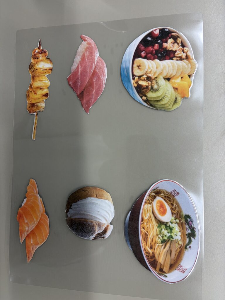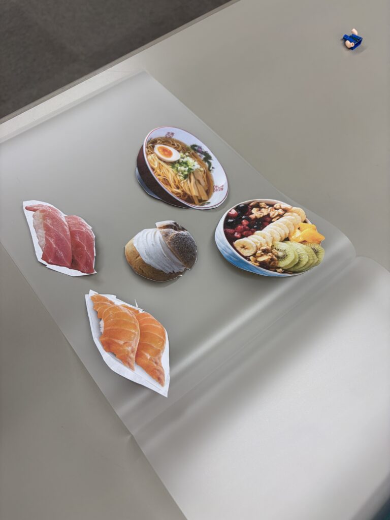 「好きな食べ物」を選ぶ子、栞にふさわしい「長細い食べ物」を探す子、「おしゃれな食べ物」「あえて苦手な食べ物」など各々考えています。この時間が、作ることへの興味をさらに高め、自分ごとになっていく大事な時間なのです。