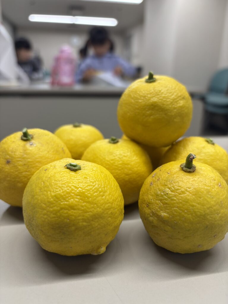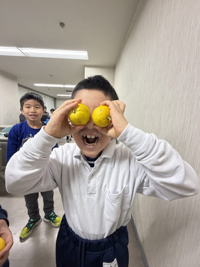 冬至〜柚子(ゆず)に触れる〜 2025年12月22日 最終更新日時 : 2025年12月22日 phry932402 今年は12/22(月)が冬至です。冬至といえば柚子風呂でしょうか。それとも南瓜でしょうか。SOBU ACADEMYでは頂いた柚子をみんなでさわったり、匂いをかいだりしてみました。一つの柚子を切ってみたら、たくさんの果汁が出てきて、柚子のいい香りが教室中にひろがりました。季節を感じる活動、五感で味わう活動って素敵ですよね。とっても幸せを感じる教室になりました。数個持ち帰って、「家でお風呂に入れてみる!」という子もいました。 Follow me! FacebookXBlueskyHatenaPocketCopy
