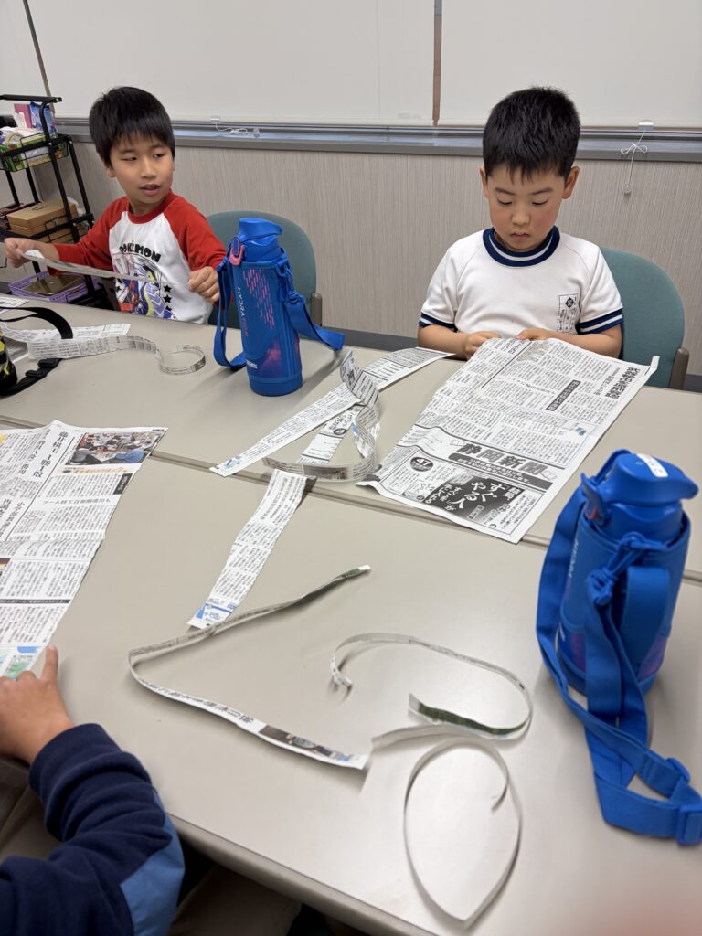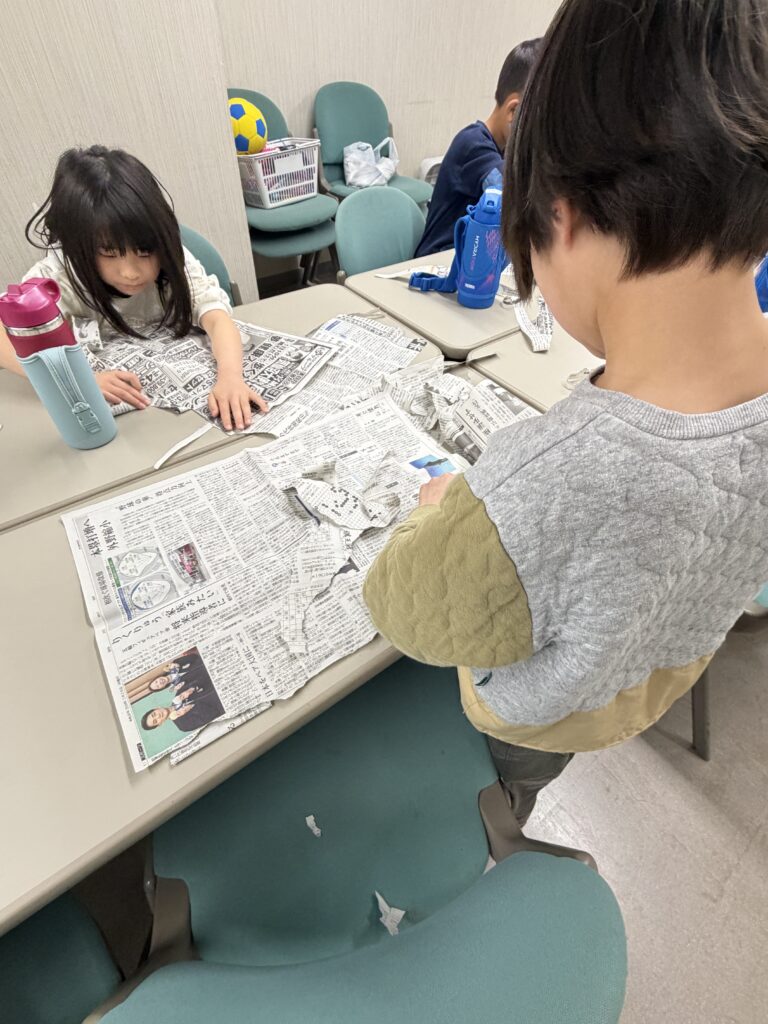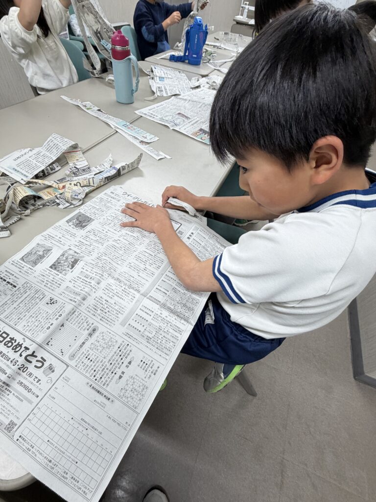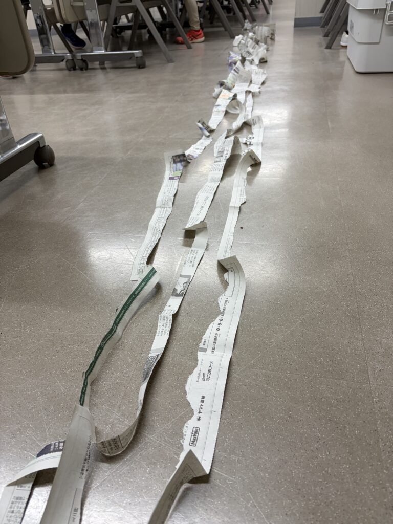 発想力が試されます。高学年はさすがの発想力で、いきなり長い新聞紙になっています。