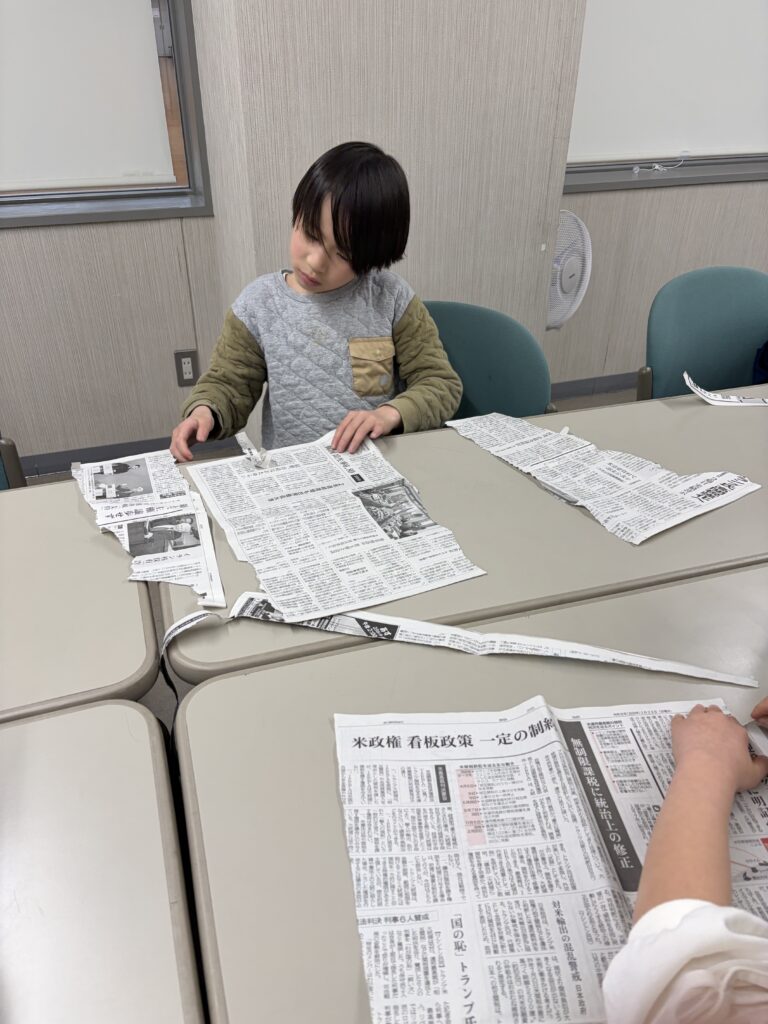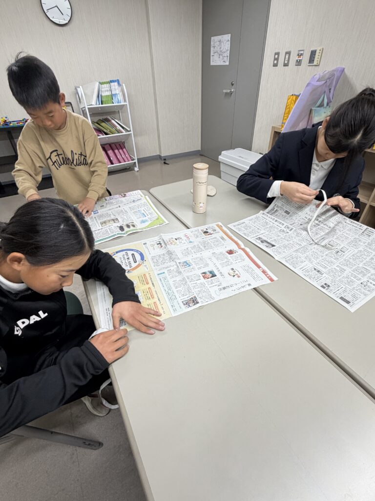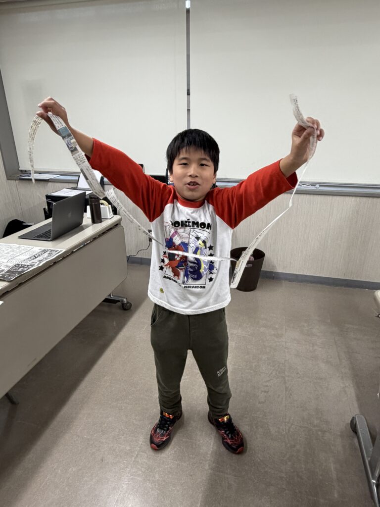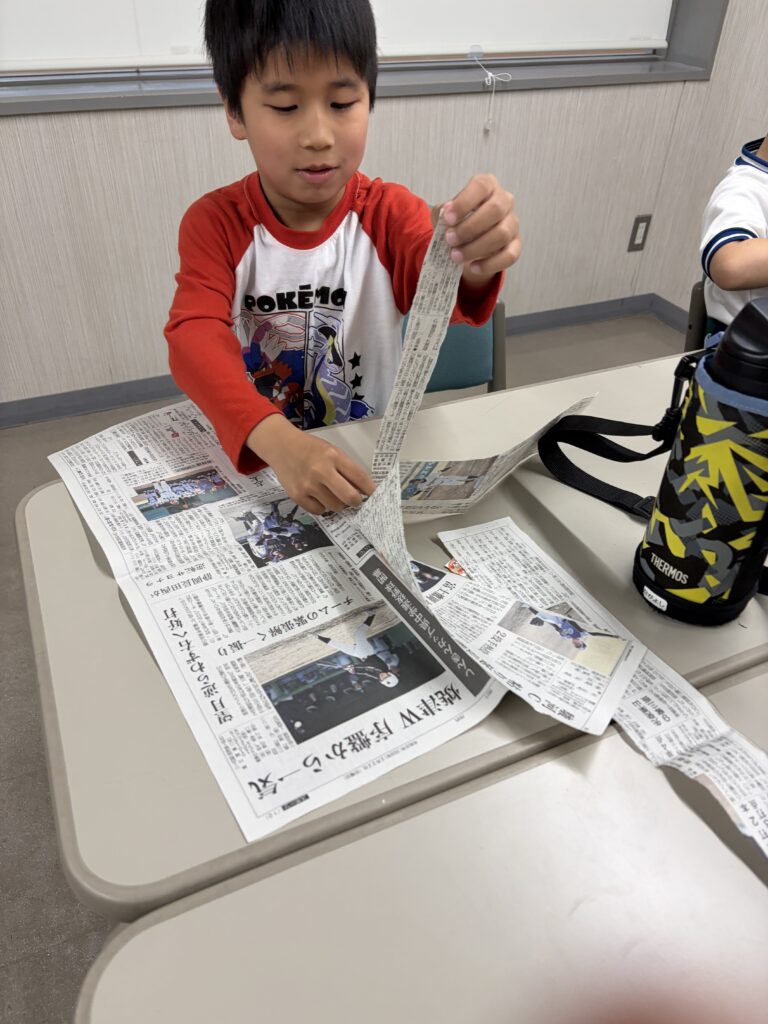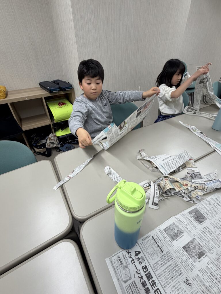 発想力が試されます。高学年はさすがの発想力で、いきなり長い新聞紙になっています。